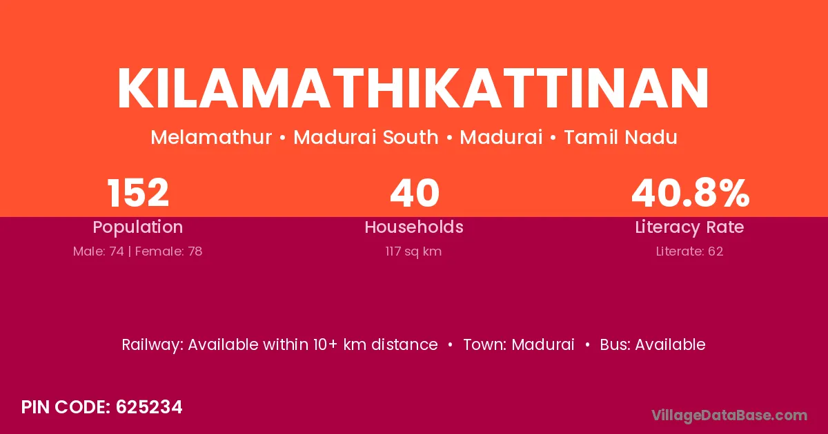 Kilamathikattinan village has a total population of 152 people, of which 74 are males and 78 are females.