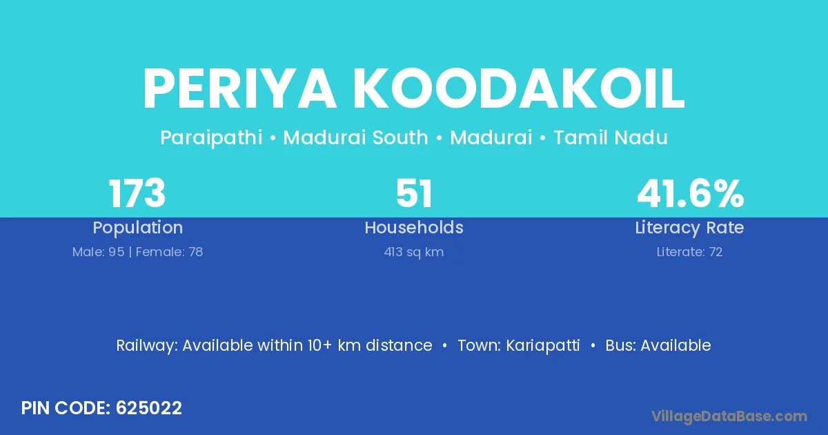 Periya Koodakoil village has a total population of 173 people, of which 95 are males and 78 are females.