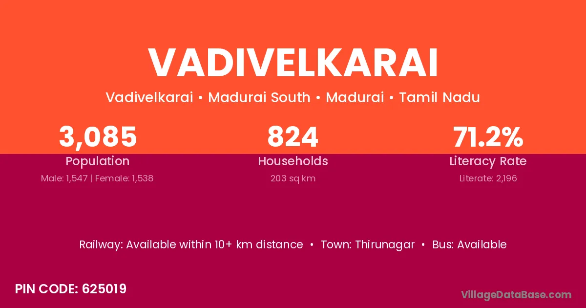 Vadivelkarai village has a total population of 3,085 people, of which 1,547 are males and 1,538 are females.