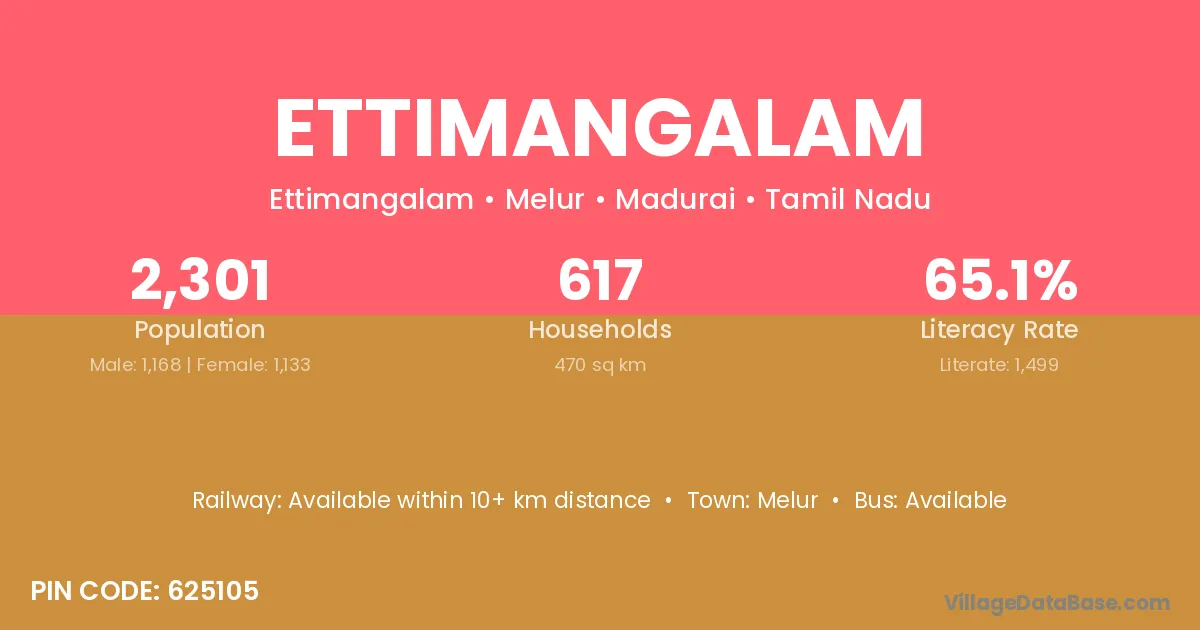 Melur is the nearest town to Ettimangalam village for major economic activities