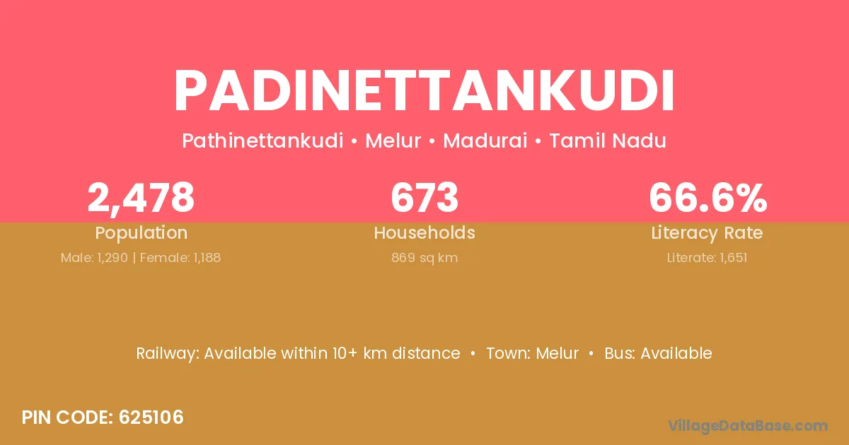 Padinettankudi village has a total population of 2,478 people, of which 1,290 are males and 1,188 are females.
