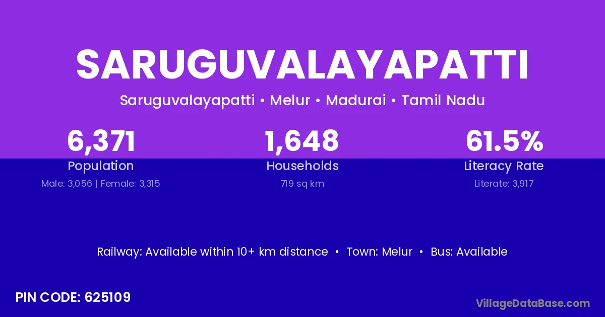 Saruguvalayapatti village has a total population of 6,371 people, of which 3,056 are males and 3,315 are females.