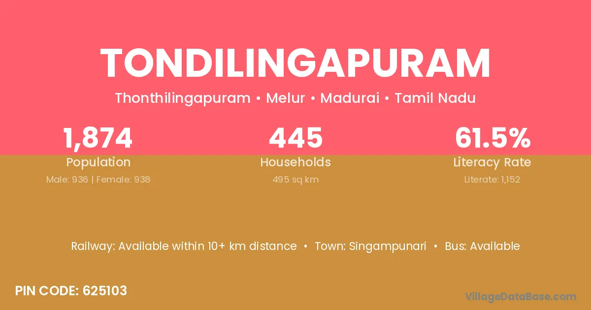 Tondilingapuram village has a total population of 1,874 people, of which 936 are males and 938 are females.