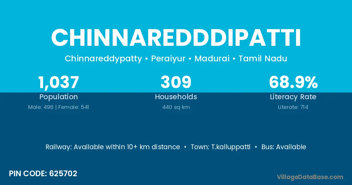 Chinnaredddipatti village has a total population of 1,037 people, of which 496 are males and 541 are females.