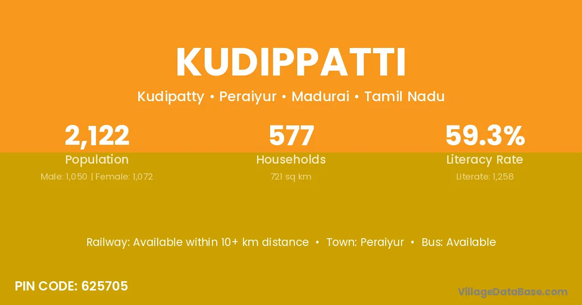Kudippatti village has a total population of 2,122 people, of which 1,050 are males and 1,072 are females.