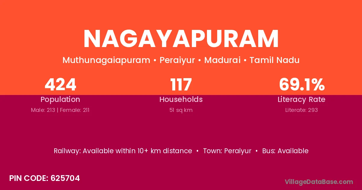 Nagayapuram village has a total population of 424 people, of which 213 are males and 211 are females.