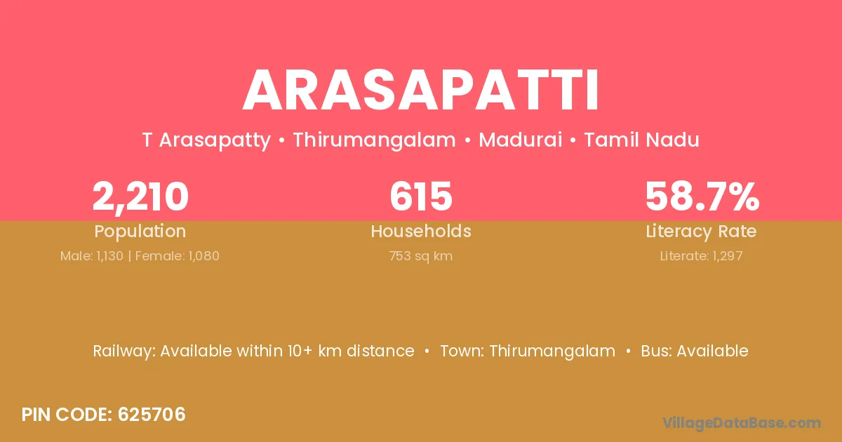 Arasapatti village has a total population of 2,210 people, of which 1,130 are males and 1,080 are females.