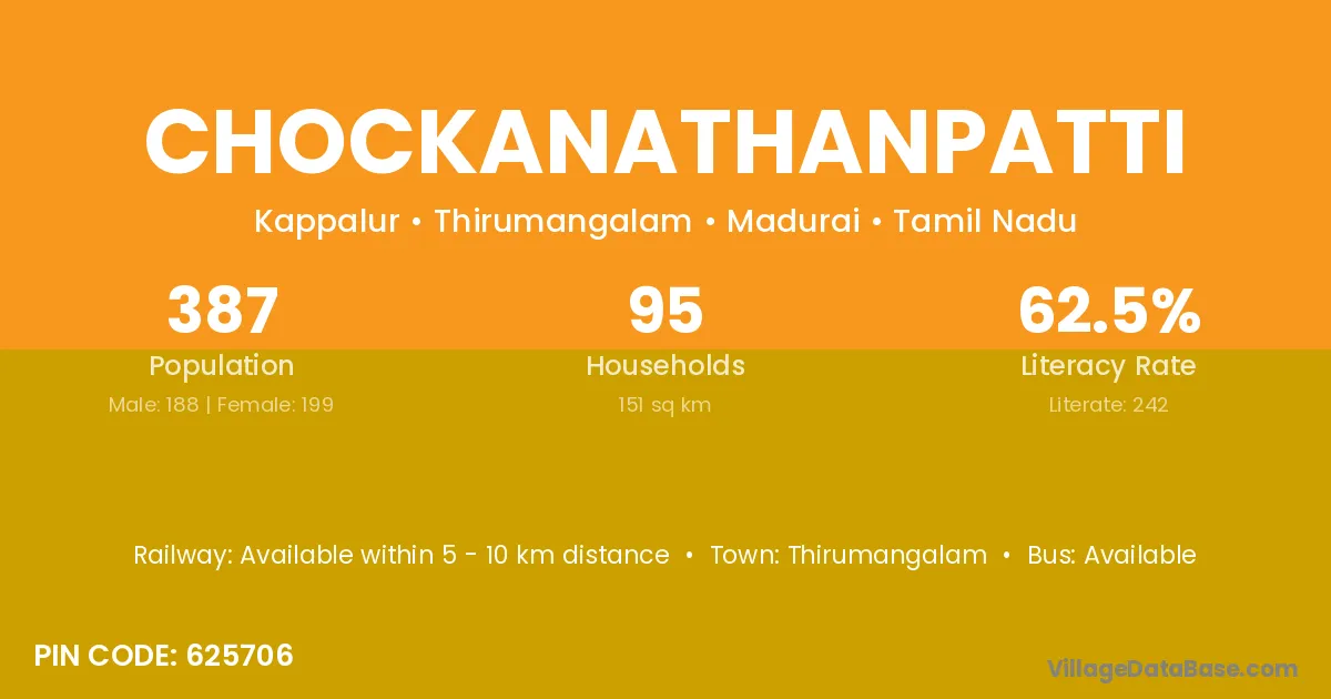 Chockanathanpatti village has a total population of 387 people, of which 188 are males and 199 are females.
