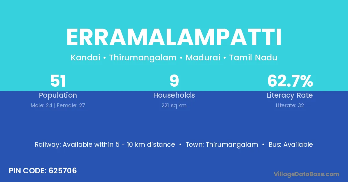 Erramalampatti village has a total population of 51 people, of which 24 are males and 27 are females.