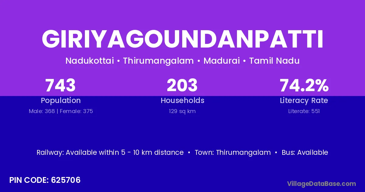 Giriyagoundanpatti village has a total population of 743 people, of which 368 are males and 375 are females.
