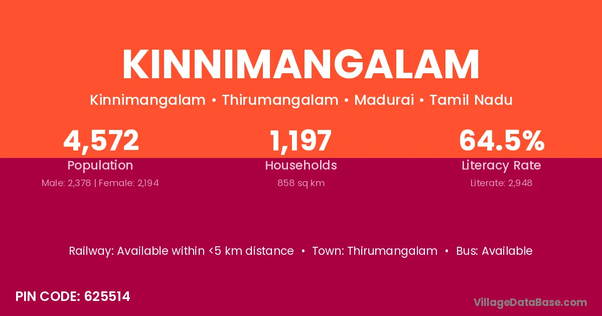 Kinnimangalam village has a total population of 4,572 people, of which 2,378 are males and 2,194 are females.