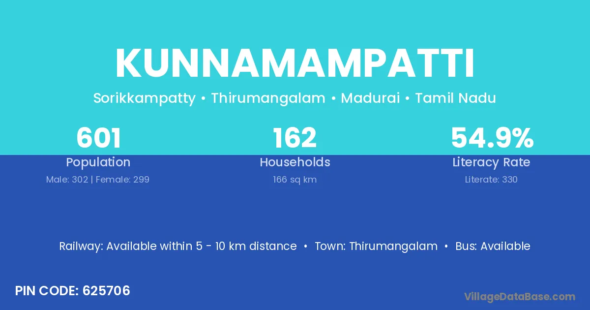 Kunnamampatti village has a total population of 601 people, of which 302 are males and 299 are females.