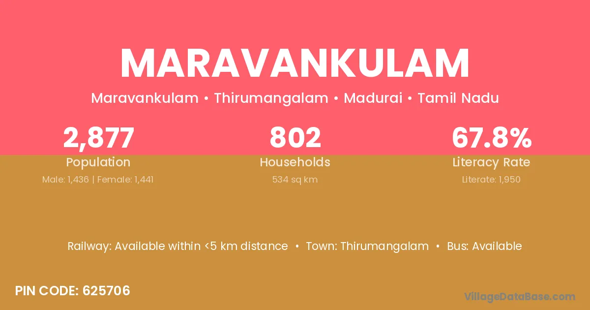 Maravankulam village has a total population of 2,877 people, of which 1,436 are males and 1,441 are females.