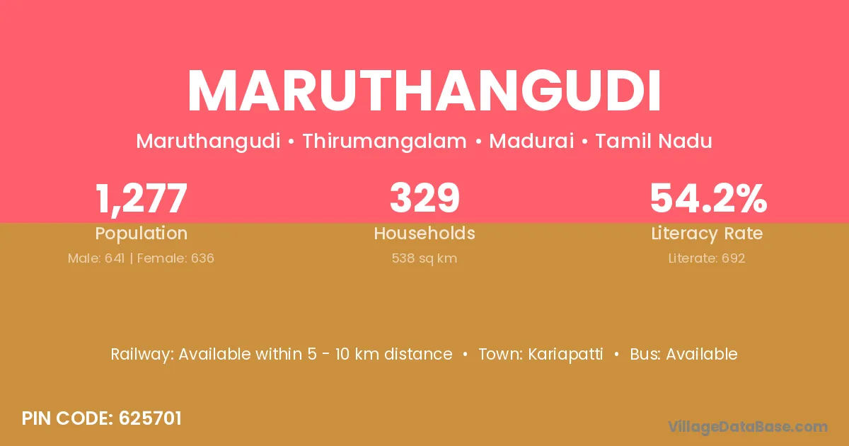 Maruthangudi village has a total population of 1,277 people, of which 641 are males and 636 are females.