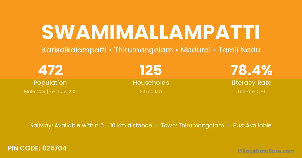 Swamimallampatti village has a total population of 472 people, of which 239 are males and 233 are females.