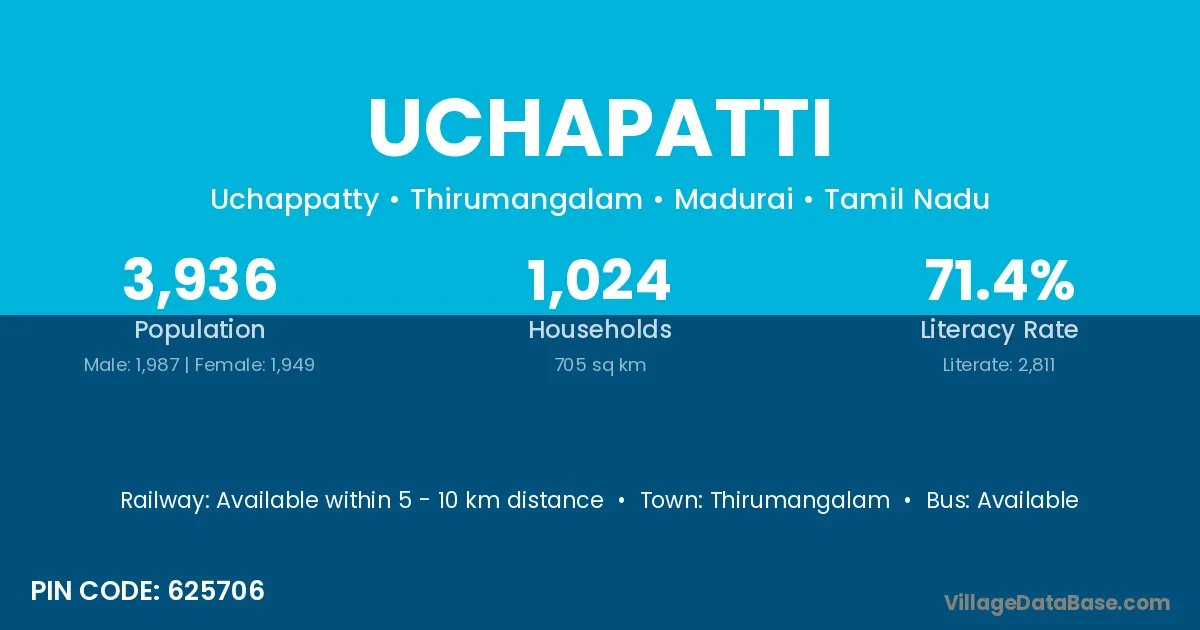 Thirumangalam is the nearest town to Uchapatti village for major economic activities