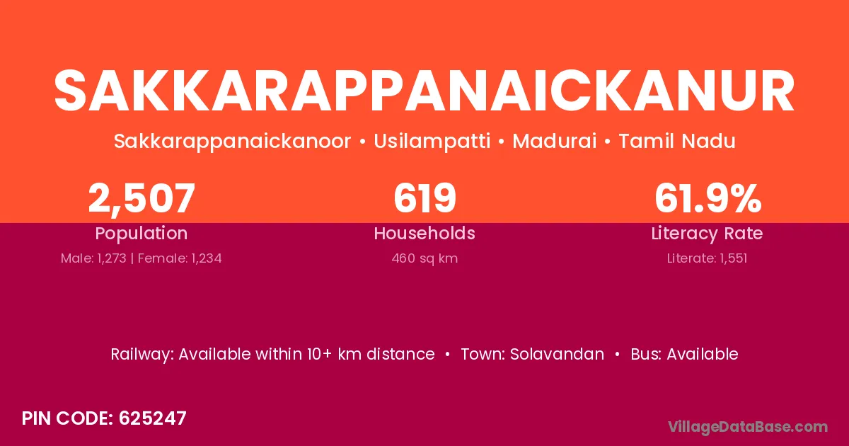 Sakkarappanaickanur village has a total population of 2,507 people, of which 1,273 are males and 1,234 are females.