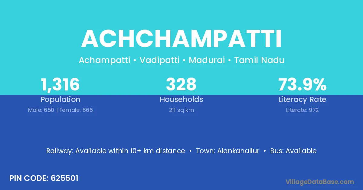 Achchampatti village has a total population of 1,316 people, of which 650 are males and 666 are females.
