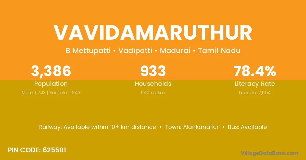 Vavidamaruthur village has a total population of 3,386 people, of which 1,743 are males and 1,643 are females.