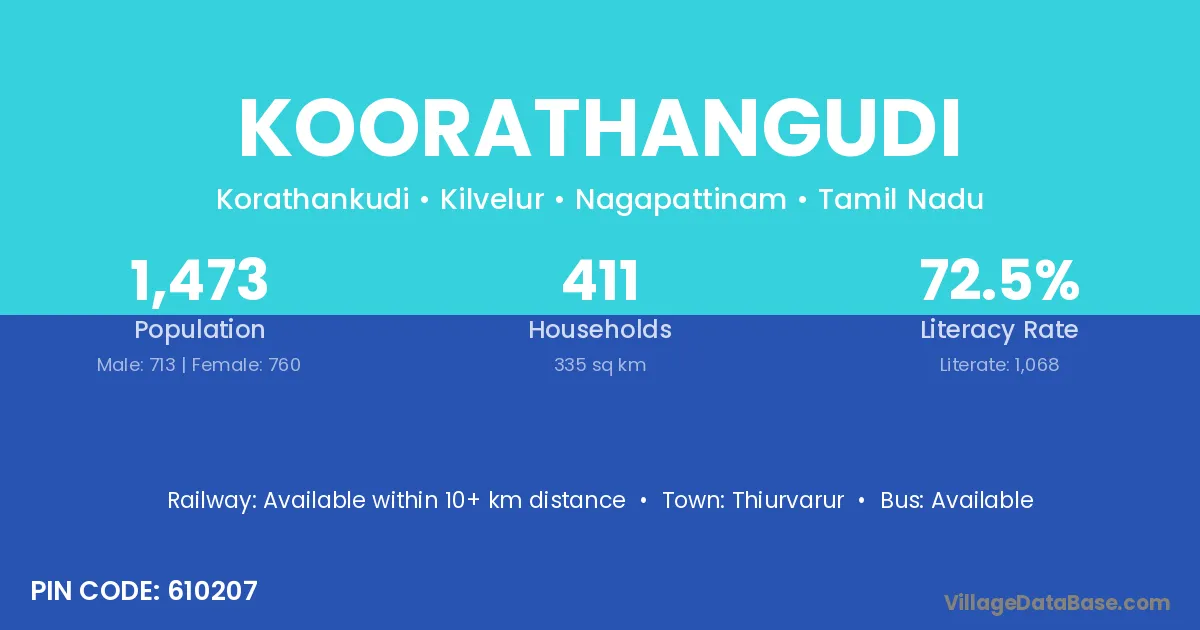 Koorathangudi village has a total population of 1,473 people, of which 713 are males and 760 are females.