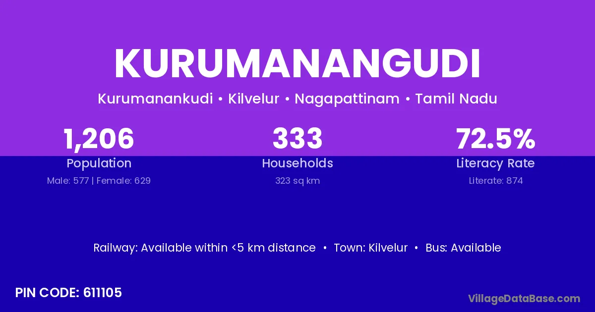 Kurumanangudi village has a total population of 1,206 people, of which 577 are males and 629 are females.