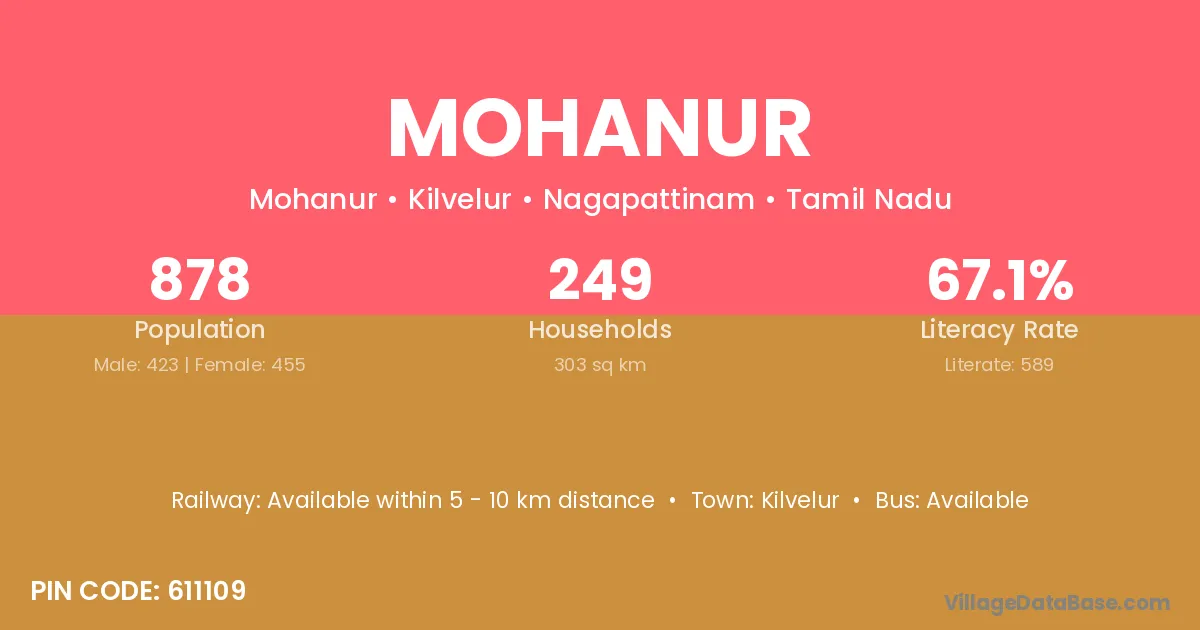 Mohanur village has a total population of 878 people, of which 423 are males and 455 are females.