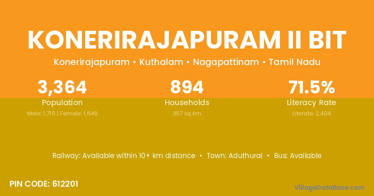 Konerirajapuram Ii Bit village has a total population of 3,364 people, of which 1,715 are males and 1,649 are females.