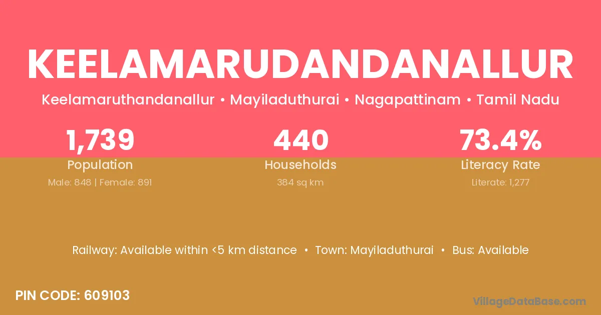 Keelamarudandanallur village has a total population of 1,739 people, of which 848 are males and 891 are females.