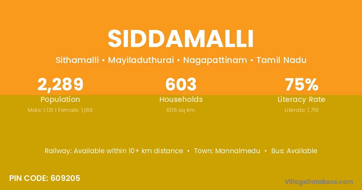 Siddamalli village is located in the Mayiladuthurai Taluka of the Nagapattinam district in Tamil Nadu .