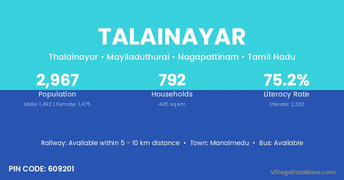 Talainayar village has a total population of 2,967 people, of which 1,492 are males and 1,475 are females.