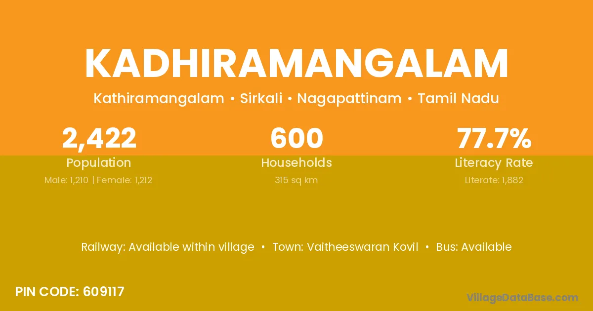 Kadhiramangalam village has a total population of 2,422 people, of which 1,210 are males and 1,212 are females.