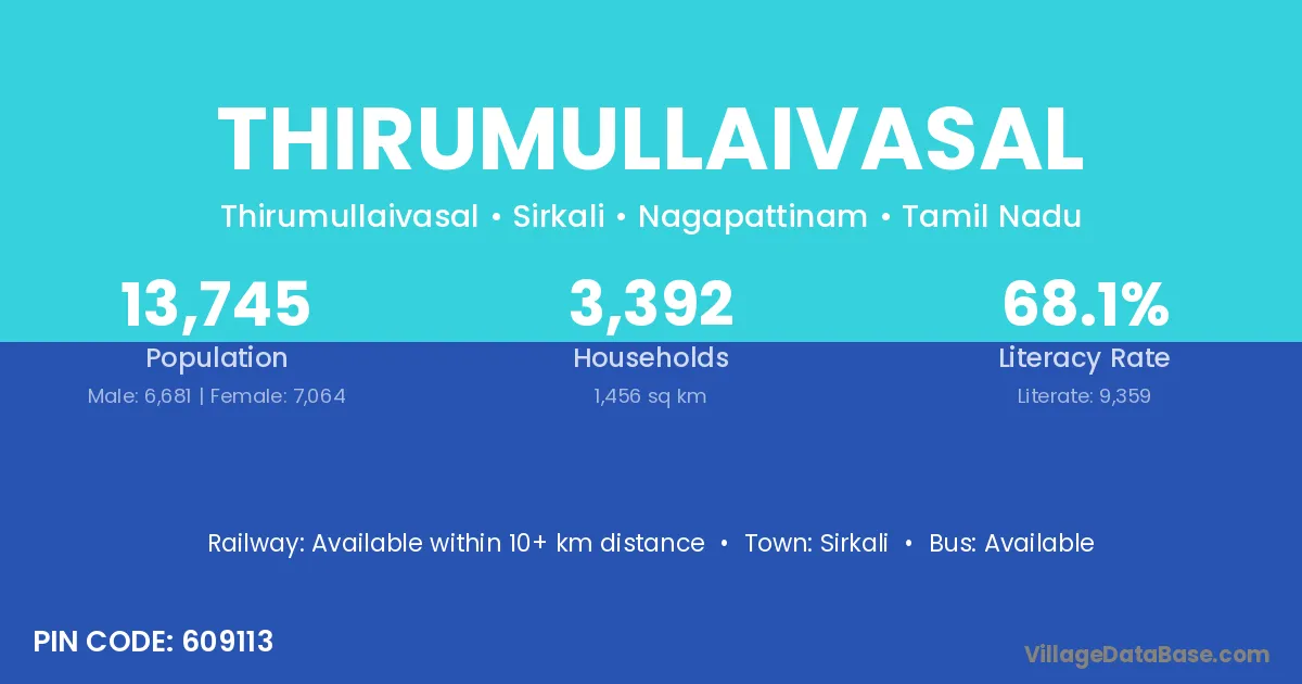 Thirumullaivasal village has a total population of 13,745 people, of which 6,681 are males and 7,064 are females.