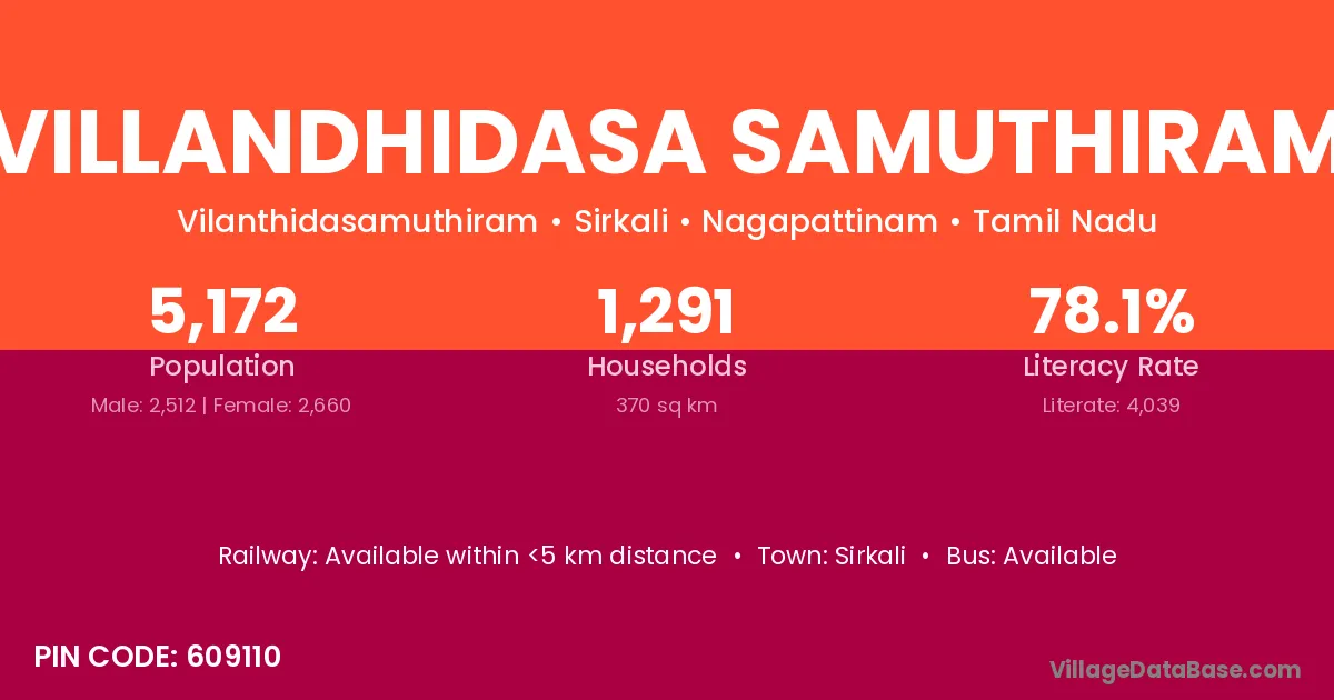 Villandhidasa Samuthiram village has a total population of 5,172 people, of which 2,512 are males and 2,660 are females.
