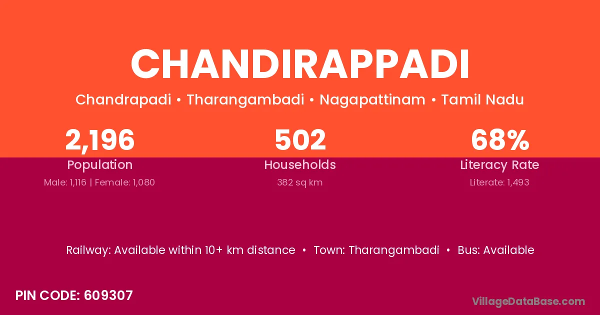 Chandirappadi village has a total population of 2,196 people, of which 1,116 are males and 1,080 are females.