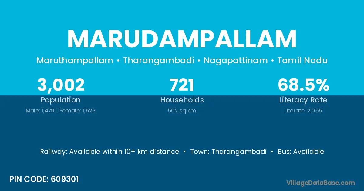 Marudampallam village has a total population of 3,002 people, of which 1,479 are males and 1,523 are females.