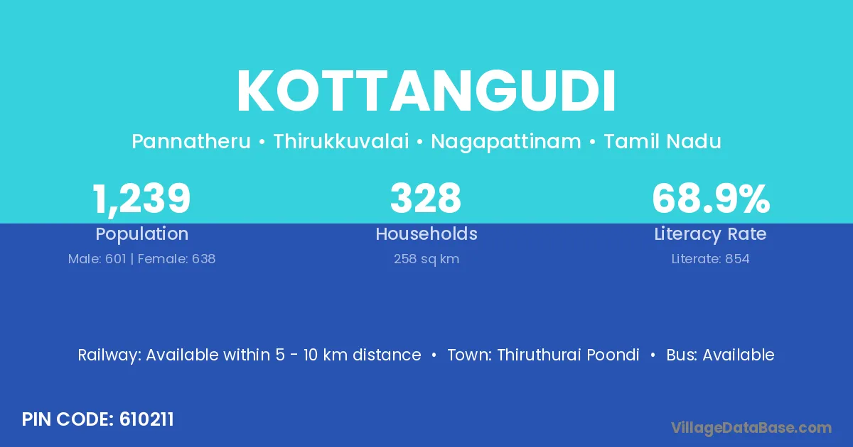 Kottangudi village has a total population of 1,239 people, of which 601 are males and 638 are females.