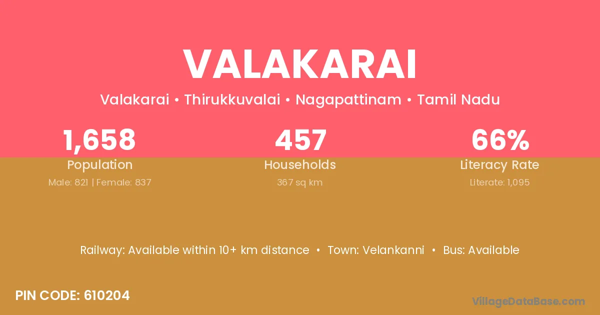 Valakarai village has a total population of 1,658 people, of which 821 are males and 837 are females.