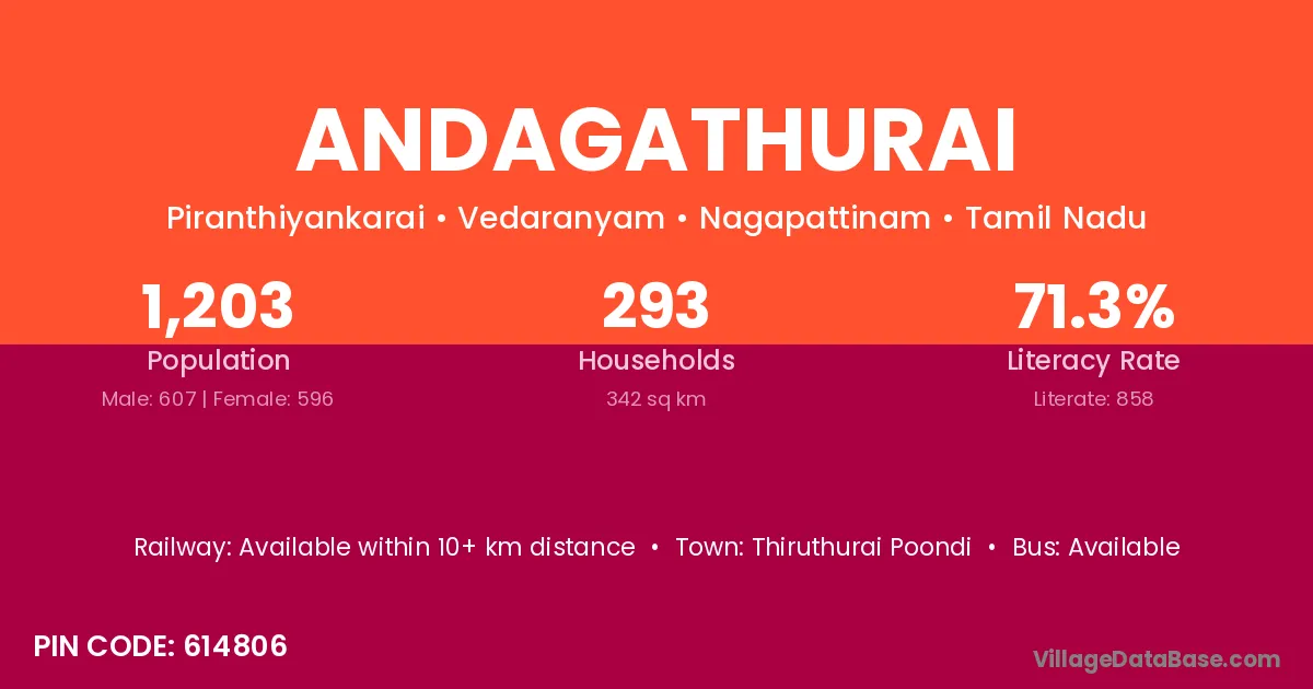 Andagathurai village has a total population of 1,203 people, of which 607 are males and 596 are females.