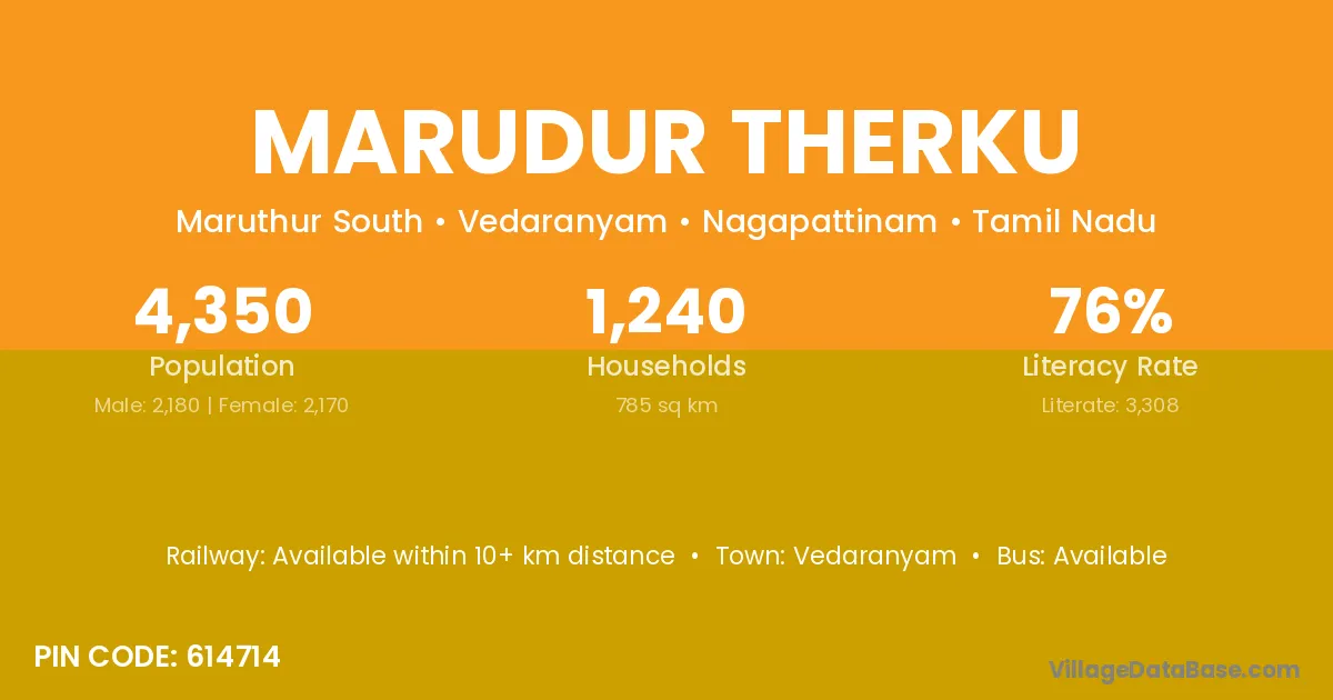 Vedaranyam is the nearest town to Marudur Therku village for major economic activities