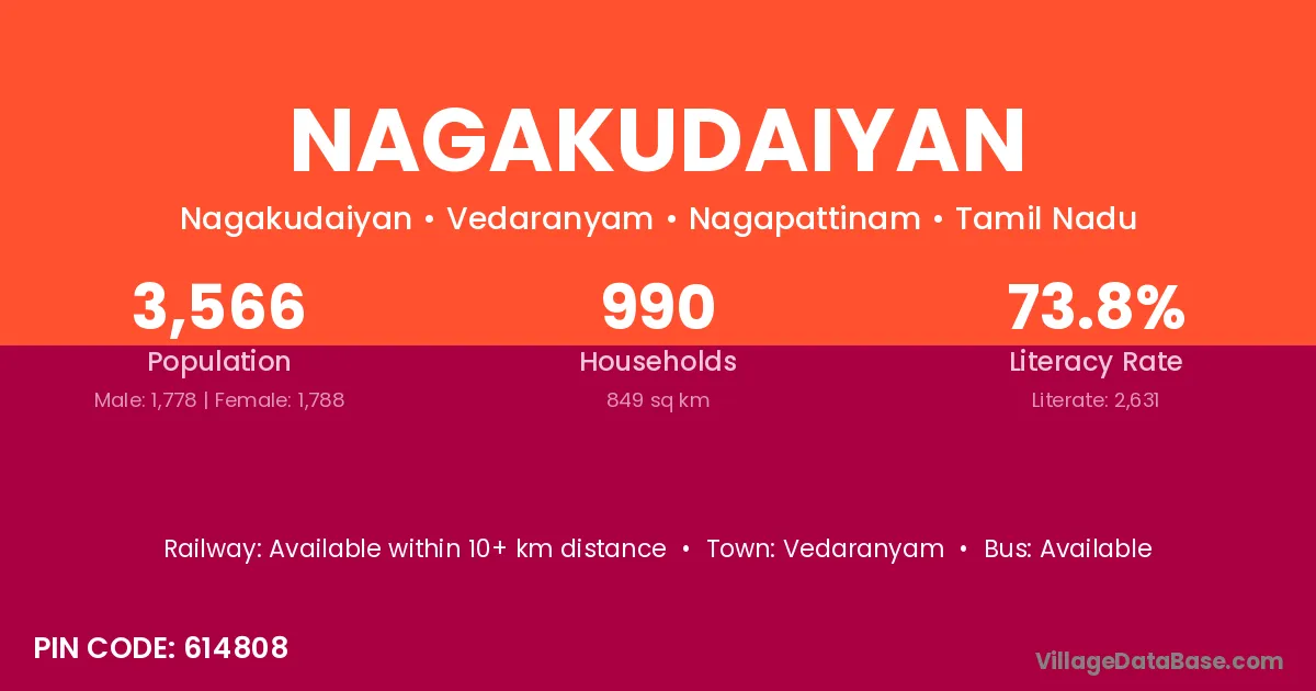 Nagakudaiyan village has a total population of 3,566 people, of which 1,778 are males and 1,788 are females.