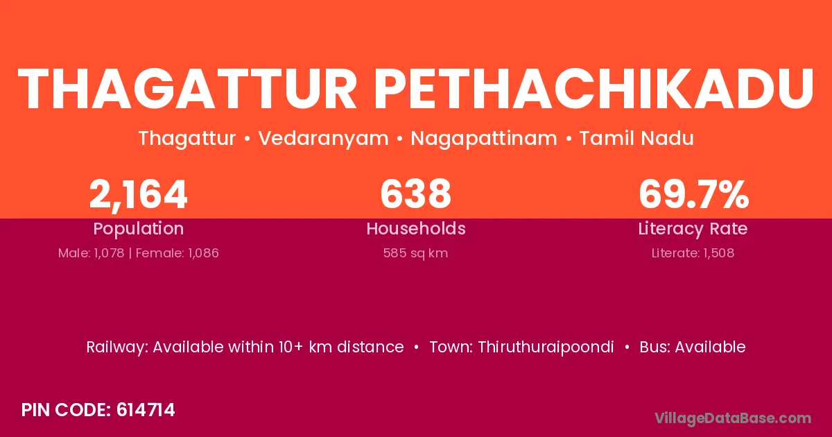 Thagattur Pethachikadu village has a total population of 2,164 people, of which 1,078 are males and 1,086 are females.