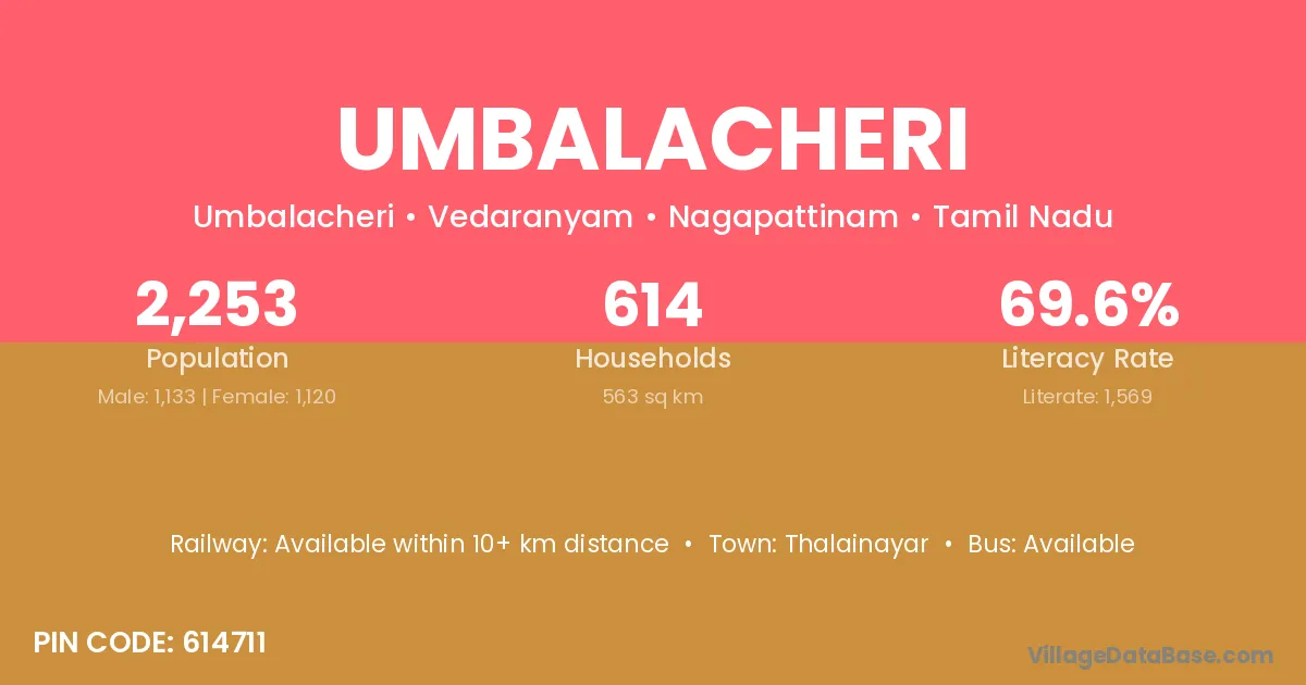 Thalainayar is the nearest town to Umbalacheri village for major economic activities