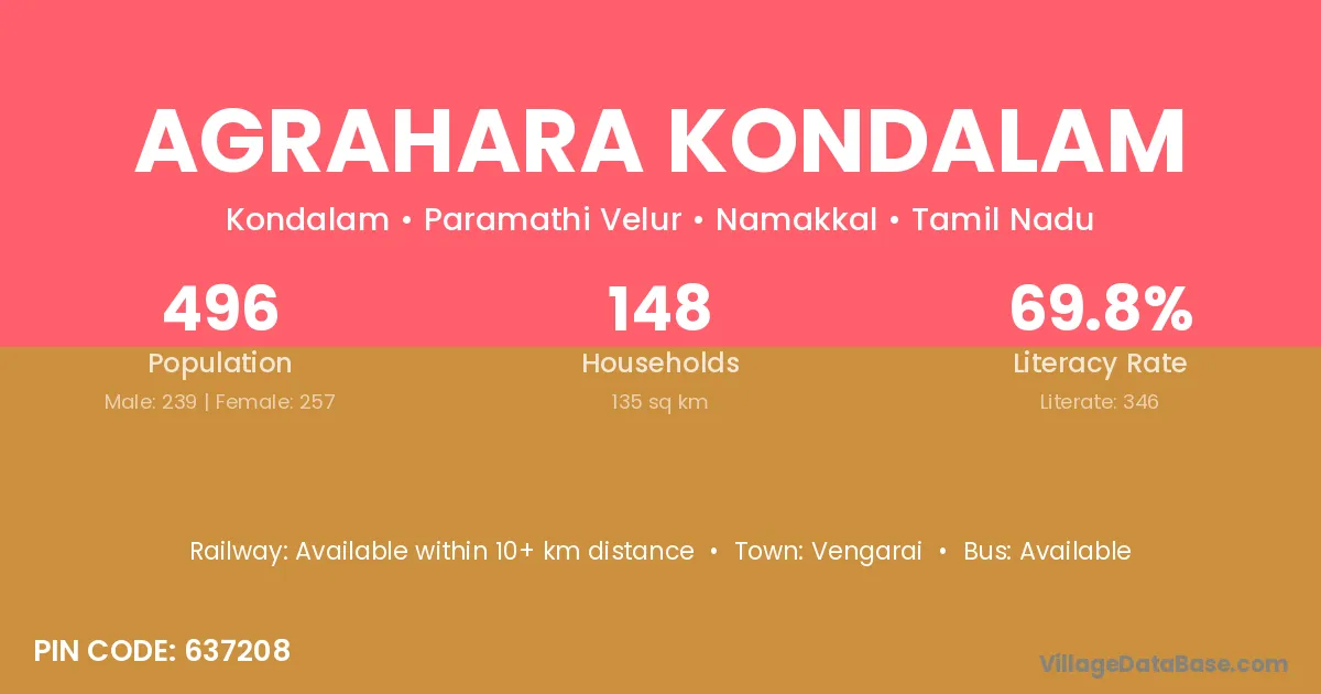 Agrahara Kondalam village has a total population of 496 people, of which 239 are males and 257 are females.