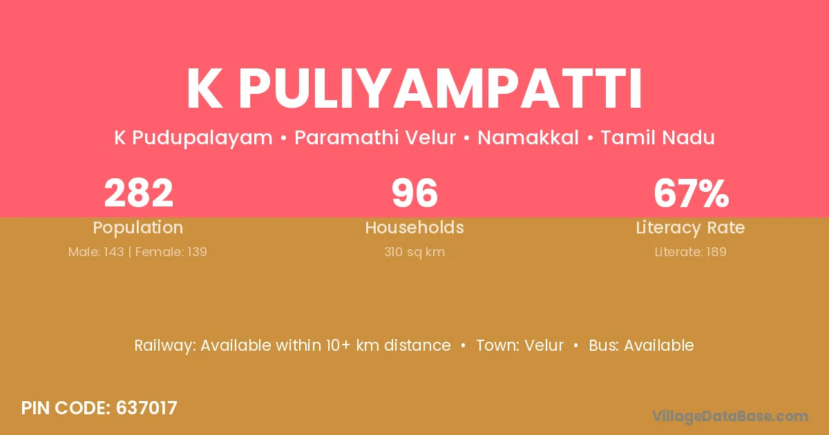 K Puliyampatti village has a total population of 282 people, of which 143 are males and 139 are females.