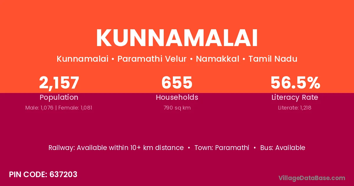 Kunnamalai village has a total population of 2,157 people, of which 1,076 are males and 1,081 are females.