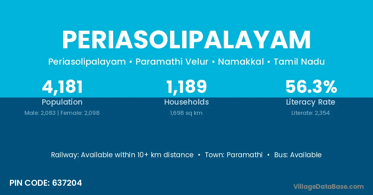 Periasolipalayam village has a total population of 4,181 people, of which 2,083 are males and 2,098 are females.