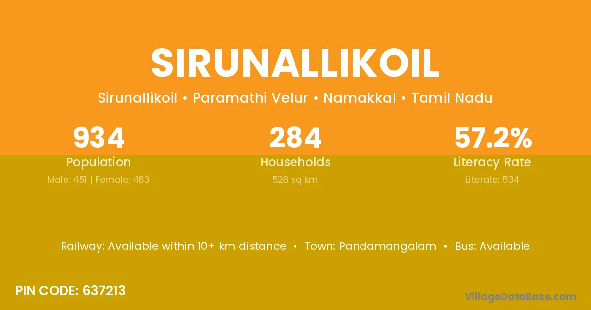 Sirunallikoil village has a total population of 934 people, of which 451 are males and 483 are females.