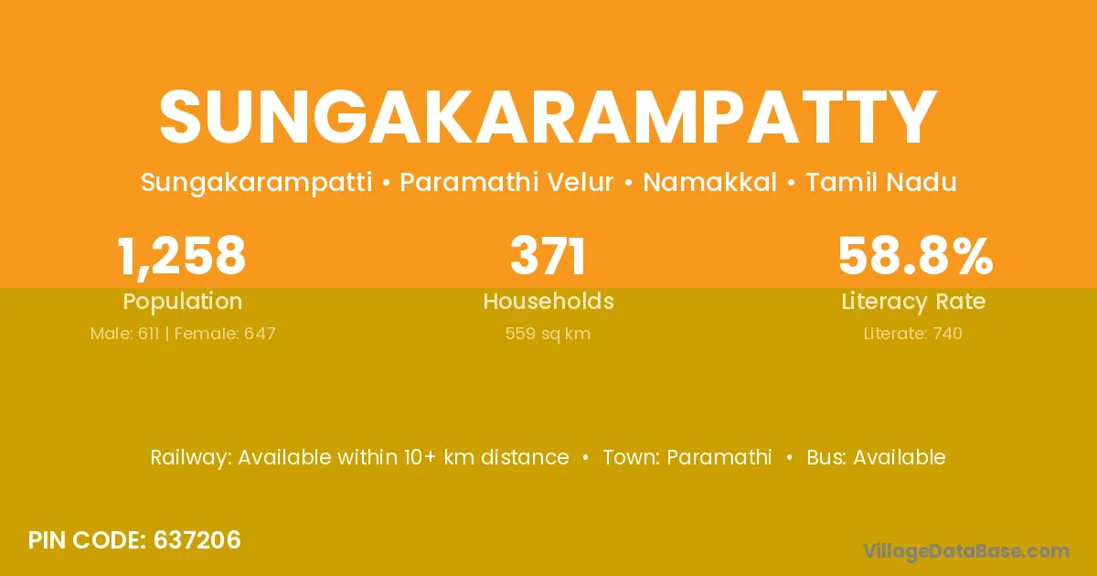 Sungakarampatty village has a total population of 1,258 people, of which 611 are males and 647 are females.