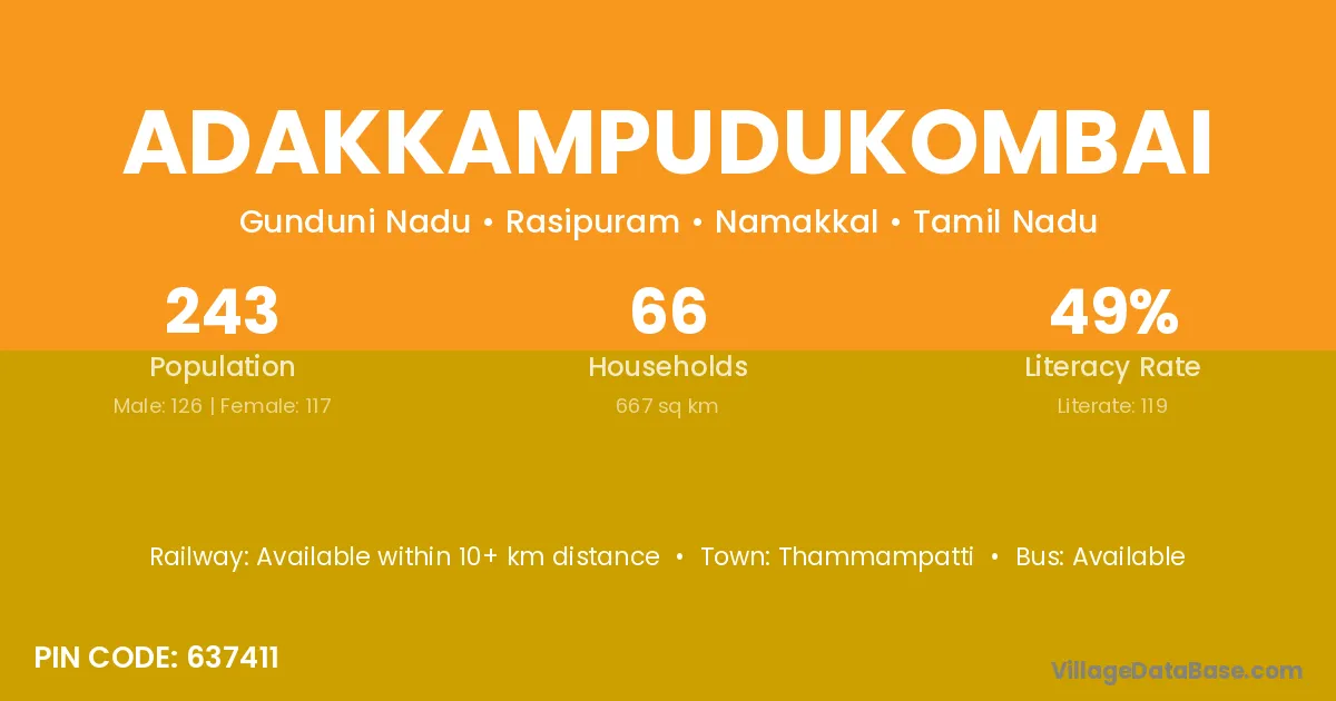 Adakkampudukombai village has a total population of 243 people, of which 126 are males and 117 are females.