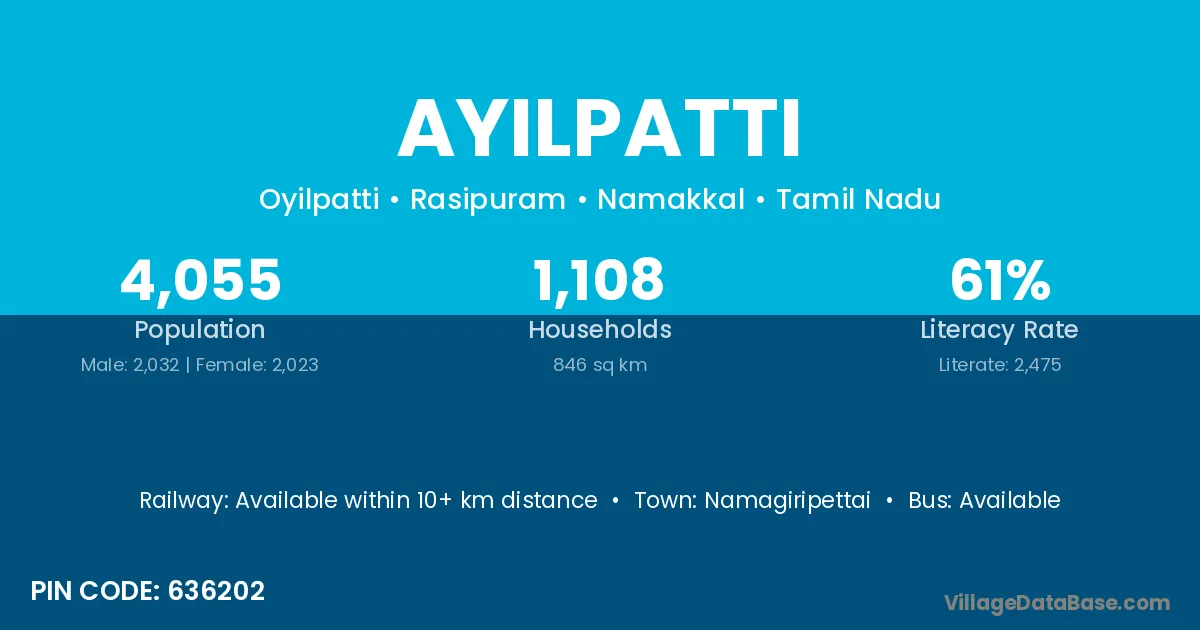 Ayilpatti village has a total population of 4,055 people, of which 2,032 are males and 2,023 are females.